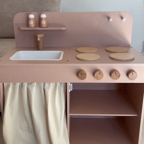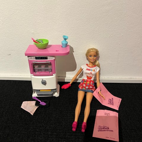 Barbie legekøkken sæt i pink plast med tilbehør. Sættet indeholder et køkkenmodul med kogeplader og hylder, to stole, opbevaringsboks samt en pose med små køkkendele og service. Egnet til leg med Barbie-dukker og andre dukker i tilsvarende størrelse.