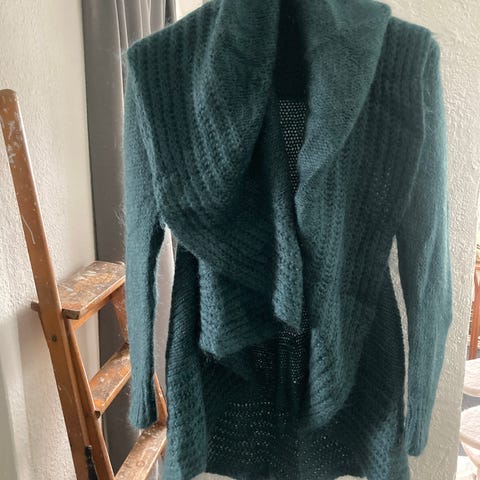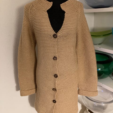 Cardigan til kvinder i str. M. Trøjen er strikket i uld og har et mønstret design i blå og lyse nuancer. Den har rund hals, lange ærmer og lukkes med knapper foran. Egnet som varm lag-på-lag trøje til hverdagsbrug. Mål kan ses på billederne med målebåndet som reference.