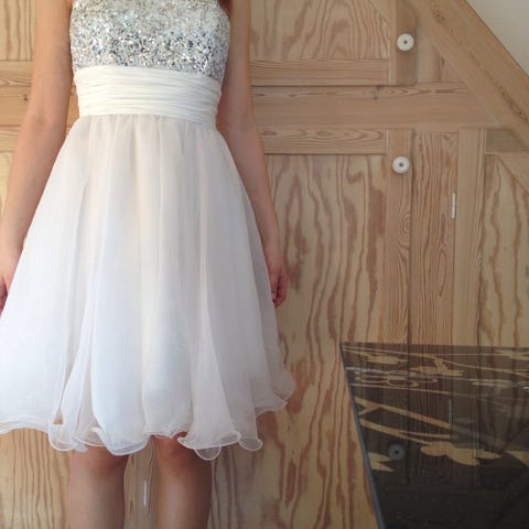 hvid konfirmationskjole med blondetop og glat skørt. Ærmeløs model med rund hals foran og dybere v-udskæring bagpå. Blondepartier ved skuldre og ryg. Kjolen har et let, svajende skørt.