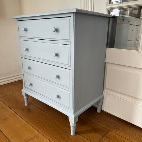 Farve og design: Kommoden er malet hvid med en let buet front på skufferne. Toppen er også hvid og har en let afrundet kant.