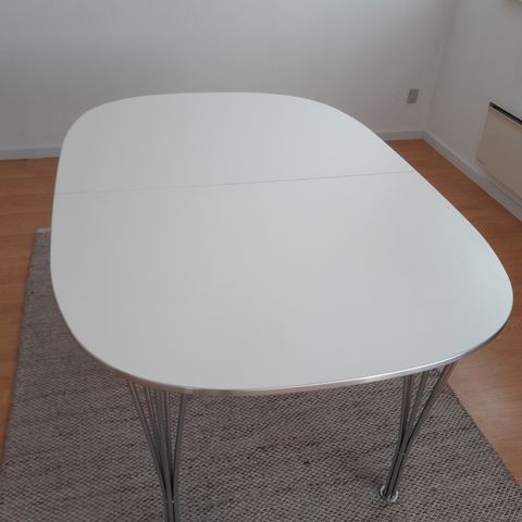 Bordet har hvid overflade, sort kant og stålfod. Bordet er dråbeformet og er 120 på bredeste led og 110 på smalleste led. Dejlig praktisk bord. Små ubetydelige brugsspor, som man ikke ser i hverdagen.