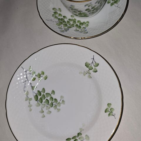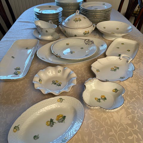 Bing & Grøndahl stel i porcelæn i blå-hvid dekoration. Stellet omfatter forskellige tallerkener, skåle, kopper med underkopper, kander, og fade i flere størrelser. Egnet til både hverdag og servering ved middage og kaffeborde. Designet har lys midte med blå kant og dekoration langs randen.