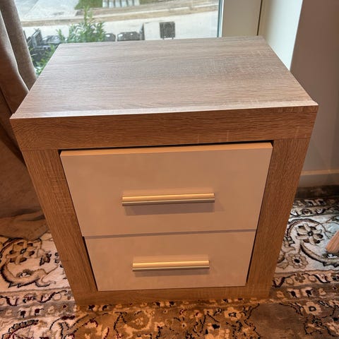 Fint og gammelt sengebord, som er nymalet, så fejler derfor ingenting. Cremefarvet udenpå og en mørk vinrød indeni skuffen.