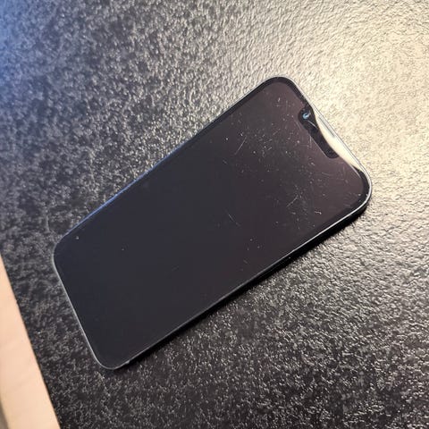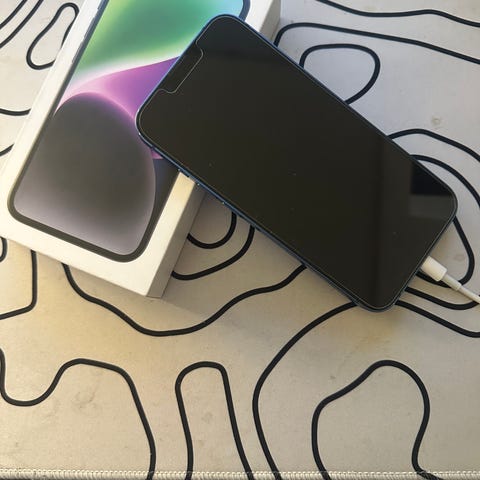 Apple iPhone 13 smartphone med 128 GB intern hukommelse. Modellen er i farven blå med fladt design og dobbelt bagkamera. Enheden har stor touchskærm på forsiden og Lightning-port i bunden. Leveres med original æske som vist på billederne. Har altid haft cower på, følger med. Batteriet er på 89%