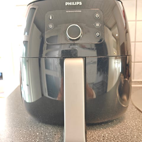 Philips airfryer i hvid med gyldne detaljer. Modellen har frontbetjening med drejeknap og flere funktionsknapper. Kurven indvendigt er belagt med non-stick materiale og har aftagelig indsats i bunden. Velegnet til tilberedning af fx pommes frites, kød, grøntsager og snacks med begrænset brug af olie. Enheden står frit på bordet og tilsluttes almindelig stikkontakt.