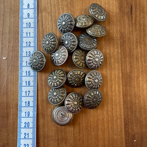 10 forskellige billeder med gamle norske knapper. Flere i tin