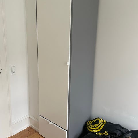 IKEA garderobeskab i hvid. Skabet har to låger og indvendig bøjlestang til ophæng af tøj. Nederst er der plads til opbevaringskasser eller sko, og øverst kan der ligeledes placeres kasser eller kurve. Velegnet til opbevaring af tøj og tilbehør i f.eks. børneværelse eller soveværelse.