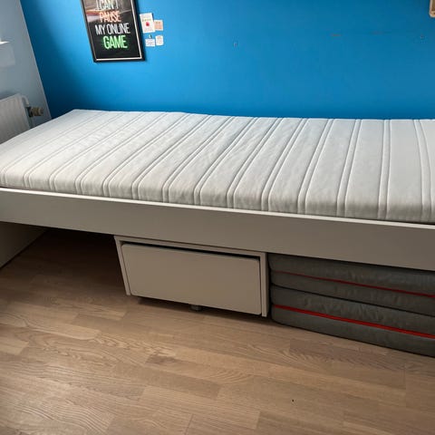 IKEA SLÄKT sengestel med underseng og opbevaring i hvid. Sengen måler 90x200 cm og består af en hovedseng med udtræksseng under, som kan bruges som ekstra soveplads. Under sengen er der integrerede opbevaringsskuffer, der kan anvendes til opbevaring af sengetøj, tøj eller legetøj. Velegnet til brug i børne- eller gæsteværelse, hvor der er behov for både seng og ekstra opbevaringsplads.