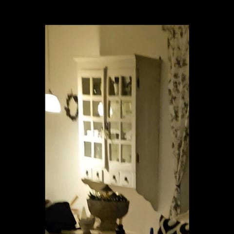 Sort, glas vitrineskab med 3 hylder og en skuffe.