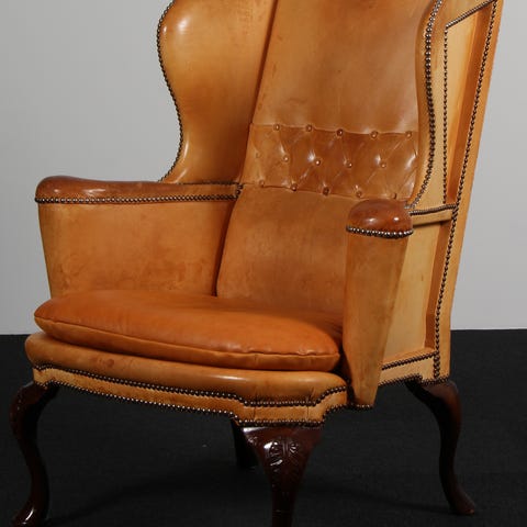 Anden arkitekt, Frits Henningsen, Lænestole, Cuba mahogni og brunt læder. Restaureret med nyt fletværk. Designet i 1931. Fabrikeret hos Frits Henningsen i 30-40'erne.