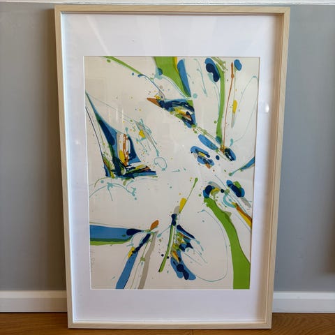 Kunsttryk med farverigt, abstrakt motiv med figurer og former i stærke farver. Trykket er monteret i lys passepartout og indrammet i enkel ramme. Velegnet som vægdekoration i stue, kontor eller andre opholdsrum.
