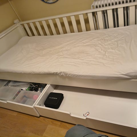 God og robust Sanders seng fra EtHjem i fin stand, dog med et par skrammer her og der (ses på billeder). Passer til madras der er 90 x 200 og der er 25cm til overkanten af lamellerne.