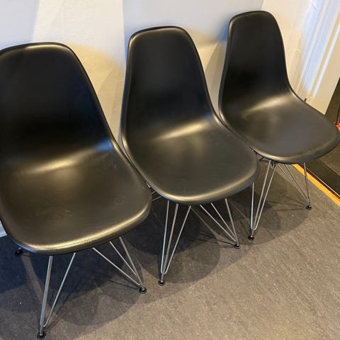 2 vintage Eames DCM stole i sortlaketet asketræ. Klassiker. Begge med finerskader. Kan fint bruges som de er. Helt faste og stabile. Har tilbud på reparation og lakering af begge for 2500kr. Men det er ikke nødvendigt. Pris samlet: 2800kr.