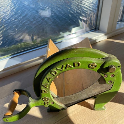 Den skønne og klassiske lyseblå brødskærer fra Raadvad. Hyggelig og robust i køkkenet. Brødskæreren (der stadig fungerer) har en skøn patina.