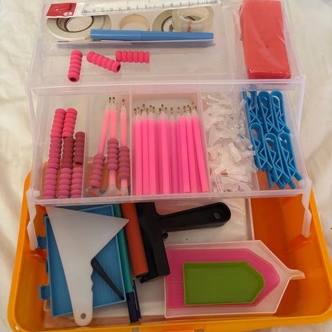 Gode ting at have til Diamond Art. Der er en lyspen, voks, tape, æsker, lim og mange flere ting. Rigtig godt at have hvis man kan lide at lave Diamond Art.