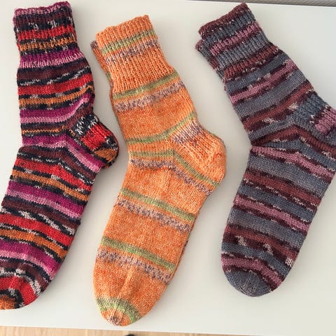 Hjemmestrikkede sokker i uld blandede farver