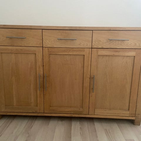 Skænk i massiv egetræ. Hvidolieret. Møblet har to låger, én i hver side, samt tre skuffer placeret i midten. Bag lågerne er der hylder, som giver mulighed for opbevaring. Den ene side er uden bagbeklædning, da vi har haft et musikanlæg stående der. Så det mangler. Men ellers i god stand. Trænger dog til en ny oliebehandling.