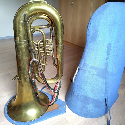 Instrumentet er en ældre sag, og har en flot patinering. Superflot til at bruge som udsmykning. Den har mærket tidens tand, men den er spilbar, og en billig måde at afprøve om tuba-spil er noget for en. Jeg sælger fordi jeg har opgraderet.