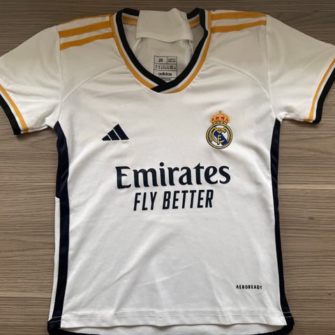Adidas Real Madrid fodboldtrøje str. M. Trøjen er i pink med mønstret print og hvide detaljer ved krave og ærmer. På brystet er der Real Madrid-klublogo samt Adidas-logo og sponsortryk på fronten. Nederst foran er der et lille Hello Kitty-motiv. Kortærmet model med polokrave og knap. Egnet som fodboldtrøje eller fritidsbluse for børn, der holder af Real Madrid og farverige trøjer.