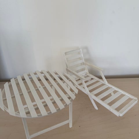 Barbie strandtilbehør legetøjssæt med båd, surfbræt og liggestole. Sættet består af en lille gul båd med sejl, et pink surfbræt med mast og farvet sejl samt to blå liggestole. De små dele er velegnede som tilbehør til Barbie-dukker og kan bruges i legemiljøer som strand, pool eller ferie. Plastmateriale egnet til indendørs leg på gulv eller i dokkernes dukkehusmiljø.
