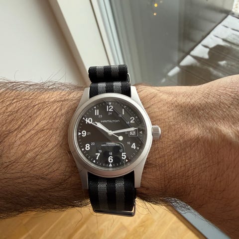 Khaki Field Mechanical Date med Hamiltons eget H-50 urværk med 80 timer reserve. Købt efteråret 2025 fra chrono24. Mørkegrøn skive som ser næsten støvet sort ud. Grøn original canvas strap og der medfølger en khaki nato strap.