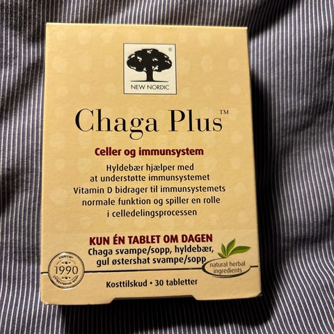Produktet er et urtetilskud baseret på chaga-svamp, leveret i glasbeholder med skruelåg.