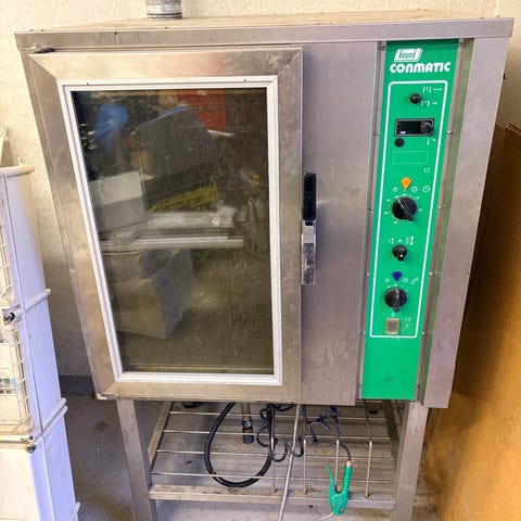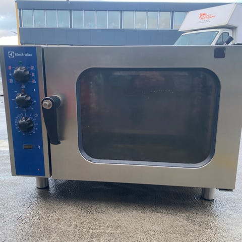 Industriel elektrisk ovn til storkøkken. Ovn i metal med frontlåge og betjeningsknapper på højre side. Egnet til brug i restaurant, café eller andet professionelt køkkenmiljø. Enheden er beregnet til bord- eller underbordsplacering og tilsluttes via elkabel. Velegnet til opvarmning og tilberedning af mad i større mængder.
