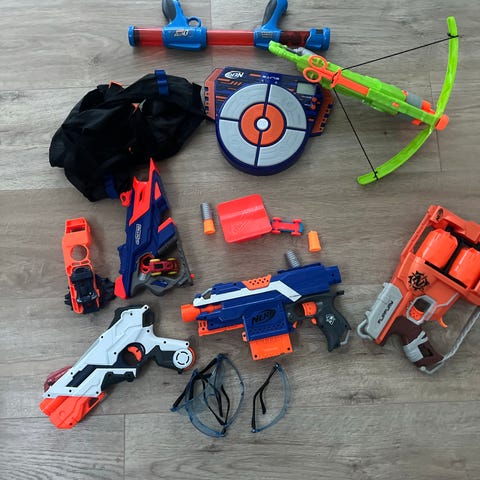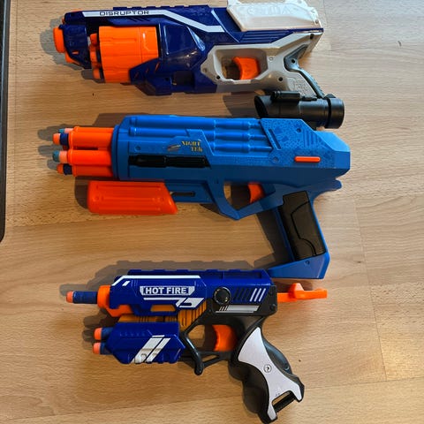 Nerf legetøjspistoler og dartblastere sæt. Sættet består af flere forskellige Nerf-inspirerede dartblastere i plast med tilhørende skumprojektiler. Produkterne er egnet som udendørs og indendørs legetøj til børn, der leger skydespil og actionlege. Der medfølger desuden forskelligt tilbehør og andet legetøj, som kan bruges sammen med blasterne i rollelege og fantasilege.