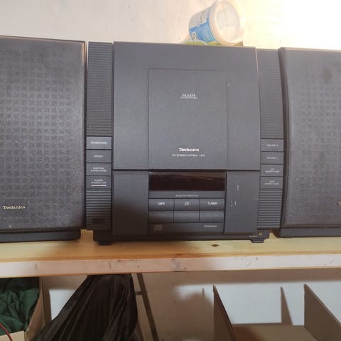 Audio Technics stereopakke. Kompakt anlæg bestående af to separate sølvfarvede hi-fi-enheder og to fritstående højttalere. Anlægget er velegnet til opsætning i reol eller på hylde og kan bruges til afspilning af lyd fra forskellige kilder, afhængigt af de tilsluttede komponenter. Egnet til brug i stue, kontor eller andre rum, hvor der ønskes et samlet stereoanlæg med separate højttalere.