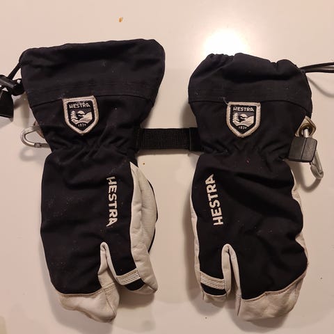 Hestra 3-finger luffe str 7. Brugt på skiferie til et af vores børn. Det kan ses at de er brugt men ingen huller eller anden slid. Farven er sort.