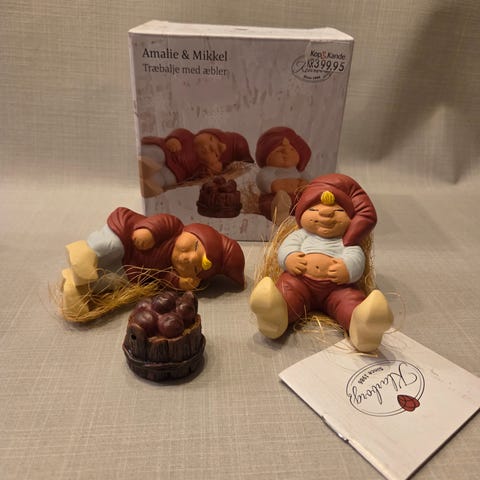 Smuk stor firårspige med lysholder. Den er 15 cm høj og i rigtig god stand, dog en lille revne i hånden hvor lysholderen sidder. Hun koster 225kr. De 2 kyllinger koster 75kr pr stk