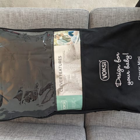 Voksipose, Voksi Classic Mini i sort. Bæreplade medfølger, så posen kan bruges som lift. I meget fin stand. Passer til kombivogne.