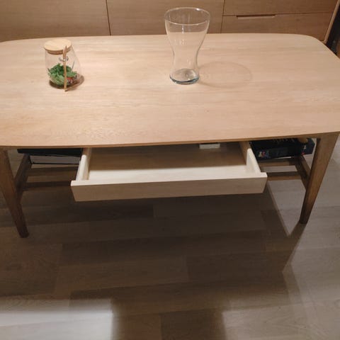 2 sofabord i massiv eg det ene målet 140cm x 80 cm og det andet 60cm x 60 cm