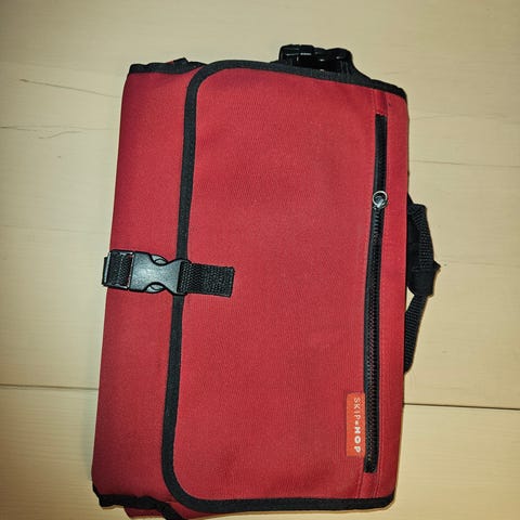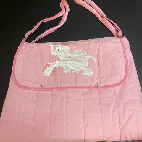 Blå taske med røde detaljer og lille elefantmotiv på forsiden. Tasken har stropper foroven, som gør den nem at hænge op eller bære i hånden. Den kan foldes ud til et større fladt stykke stof, hvilket gør den egnet til opbevaring eller transport af mindre genstande. Tasken er velegnet til brug i hjemmet, på farten eller til organisering af babyudstyr og tilbehør.