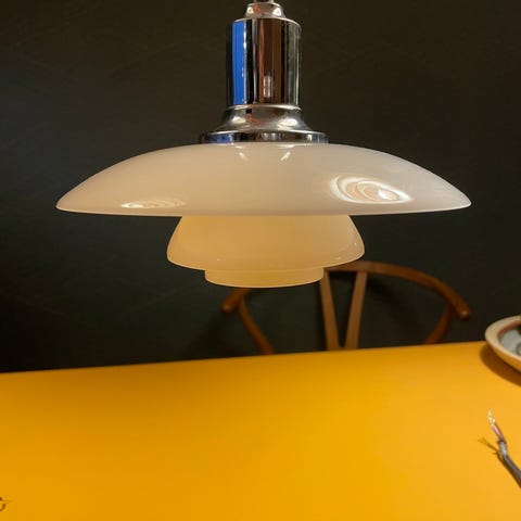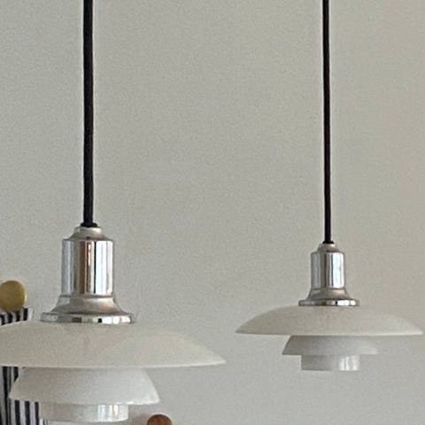 Lampen er udført med hvid skærm i glas og sort fatning/ophæng.