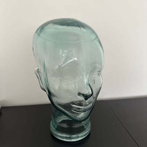 Glashoved i gennemsigtigt glas. Hovedformet glasobjekt velegnet som dekoration, udstillingshoved til hatte, briller eller parykker, eller som anderledes indretningsdetalje. Fremstillet i klart glas med markerede ansigtstræk og plan bund, så det står stabilt på bord eller hylde.