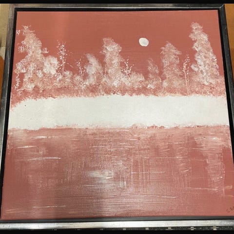Maleri landskab i lyse nuancer med hvid ramme