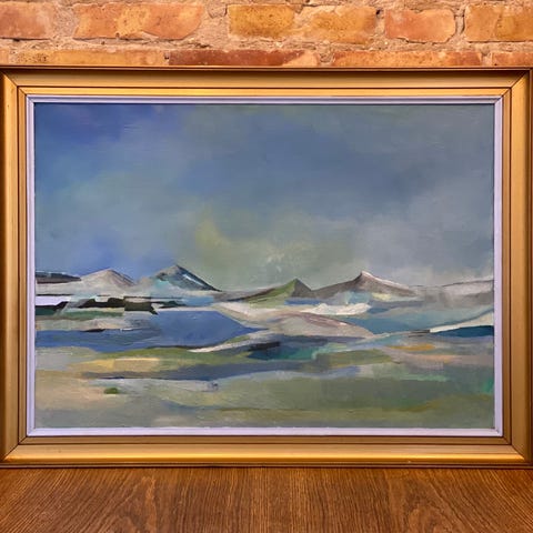 Maleri med abstrakt landskabsmotiv i lyse, dæmpede nuancer af grå, grøn og blå. Billedet er indrammet i en hvid, profileret ramme. Motivet kan fungere som vægdekoration i eksempelvis stue, soveværelse eller kontor. Velegnet til ophængning alene eller som del af en billedvæg.