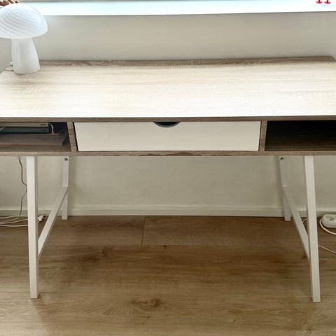 Sort skrivebord, reol (165 x 60 x 32 cm) og kontorstol. Meget velholdt. Prisen er for hele sættet.