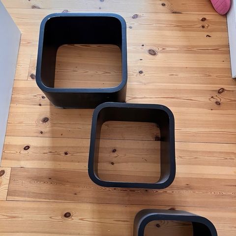 Fire vægkasser og tre skinner (som vist på billederne) af mærket "Natural Signature" fra Sinnerup. Kasserne kan skilles og bygges i forskellige størrelser. Mindste side på en kasse er 21cm og længste side er 67 cm.