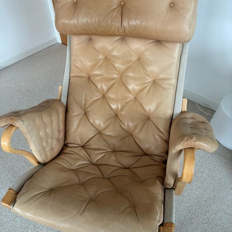 Sælger en original Bruno Mathsson Pernilla lænestol med høj ryg inkl. fodskammel.