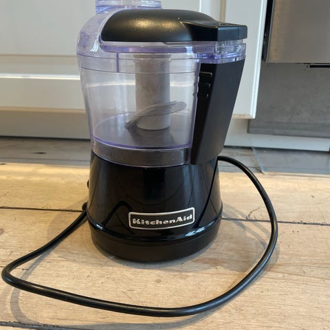 KitchenAid mini hakker foodprocessor i sort og hvid. Kompakt elektrisk hakker med gennemsigtig beholder og aftageligt låg.
