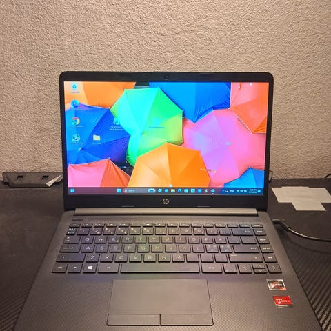 HP Stream bærbar computer med 14" skærm i blå farve. Tastatur i hvidt layout med blå håndledsstøtte og touchpad. Let og kompakt, egnet til almindelige computeropgaver som internetbrug, tekstbehandling og let kontorarbejde. Leveres med oplader, som ses på billederne. Windows 10 installeret