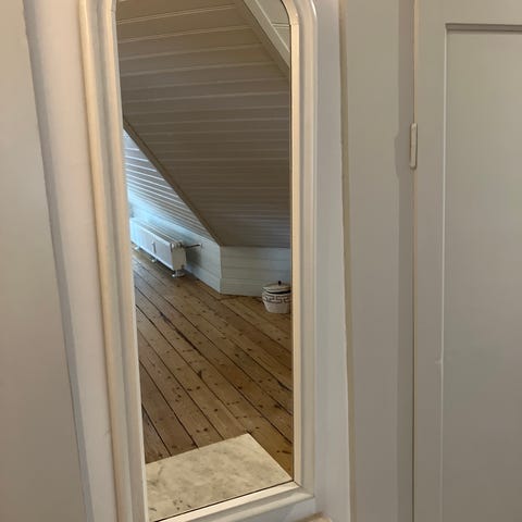 Rektangulært vægspejl med hvid, profileret ramme med dekorative detaljer.