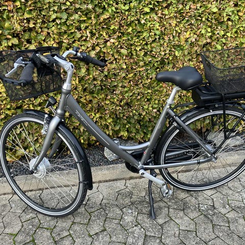 Gearskiftet betjenes med en drejeknap på styret. Sædet er polstret, og cyklen har skærme og kædeskærm, der beskytter mod snavs.