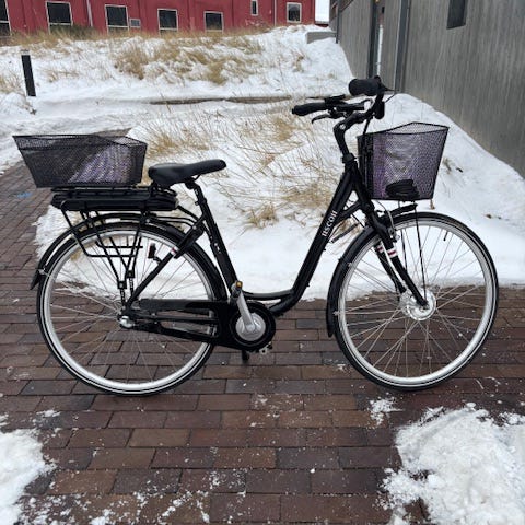Elvira Madigan-cykel til kvinder, størrelse M, med 28" hjul. Cyklen er elektrisk og udstyret med en motor i forhjulet. Den har den klassiske geometri af en bycykel med lavt stel, bagagebærer og fast kurv foran.