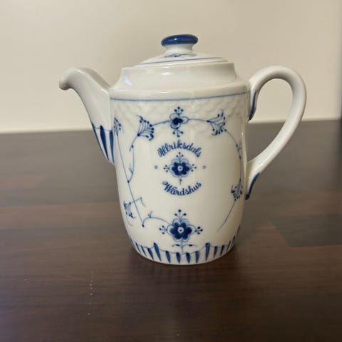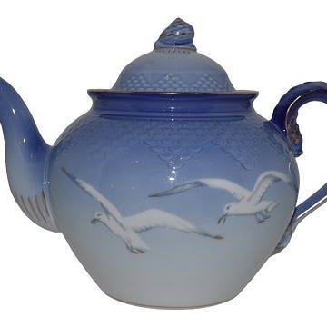 Tekanden har reliefdekoration med måger og skælstruktur foroven samt formet hank og tud.