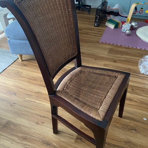 Pæne spisebordsstole i pænt lyst træ, enkelte trænger til en rens på sædet. Men fremstår rigtige pæne i træet.