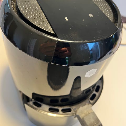 OBH Nordica airfryer i sort. Modellen har justerbar temperatur og timer via drejeknap på fronten. Udtræksskuffe med aftagelig kurv og rist, egnet til tilberedning af f.eks. pommes frites, kød, grøntsager og snacks med lidt eller ingen olie. Enheden er beregnet til bordplacering i køkkenet og tilsluttes med almindelig netstrøm.