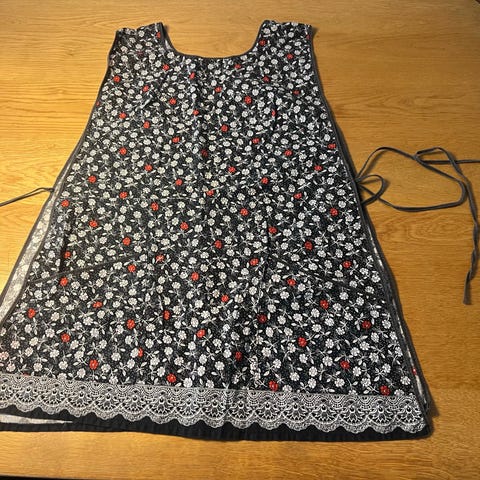 Herligt forklæde, jeg vil mene størrelse M, men målene følger her: